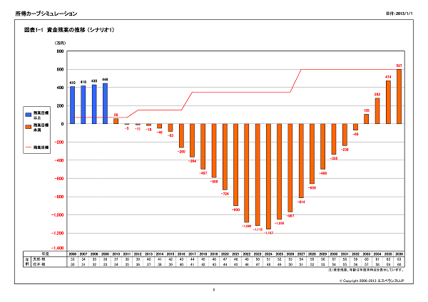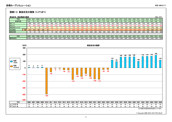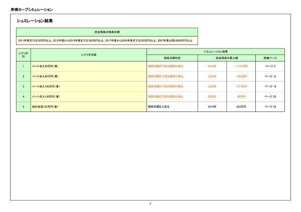 シミュレーション結果のサマリーを作成します。資金残高が残高目標を上回るかの判定や教育費の支出合計額を表示します。