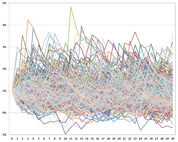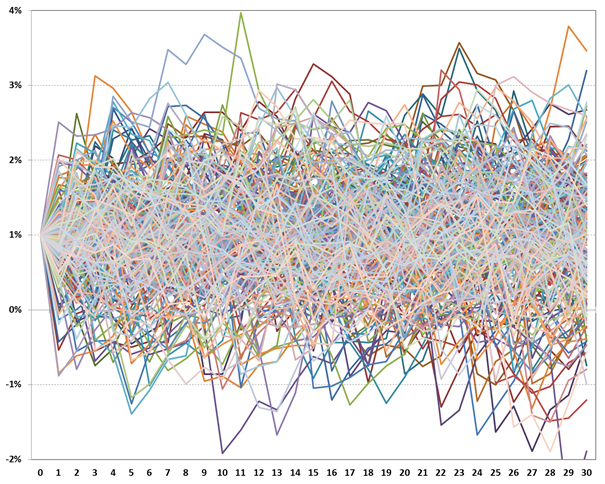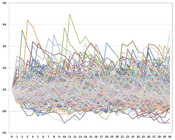 以下は、物価上昇率、収入(給与収入または所得)のベースとなる上昇率、運用利回りぞれぞれについて、ファイナンシャルスキャニングで使用するシナリオ10000個のうちの255個をグラフ化したものです。(資金残高キャッシュフローの段階で、将来の物価上昇率、収入(給与収入または所得)のベースとなる上昇率、運用利回りが全期間一律1%の場合だった場合)