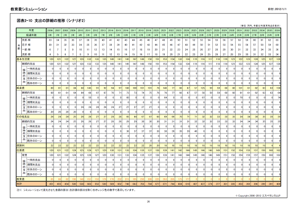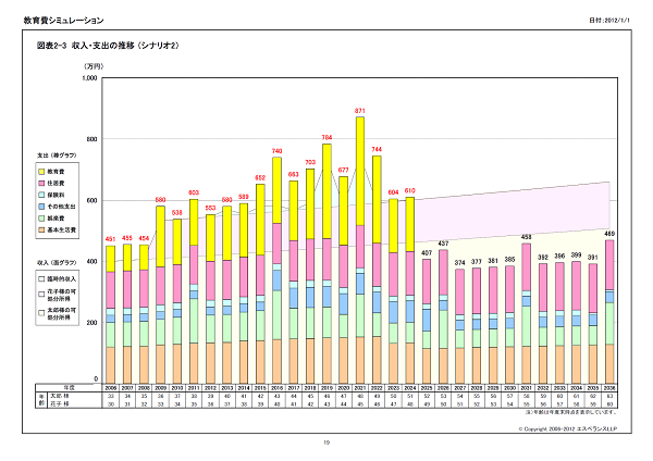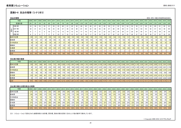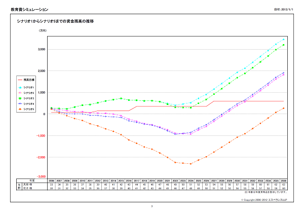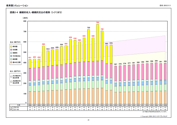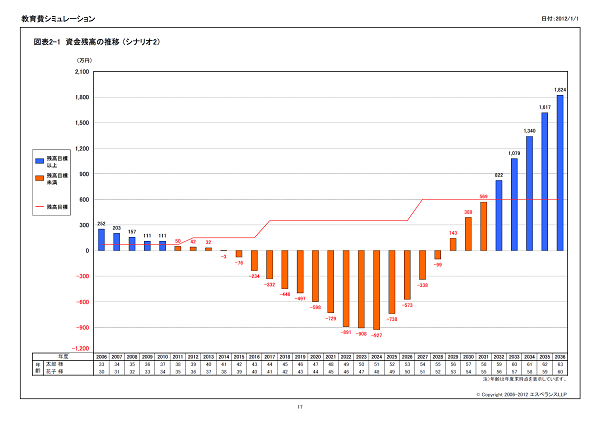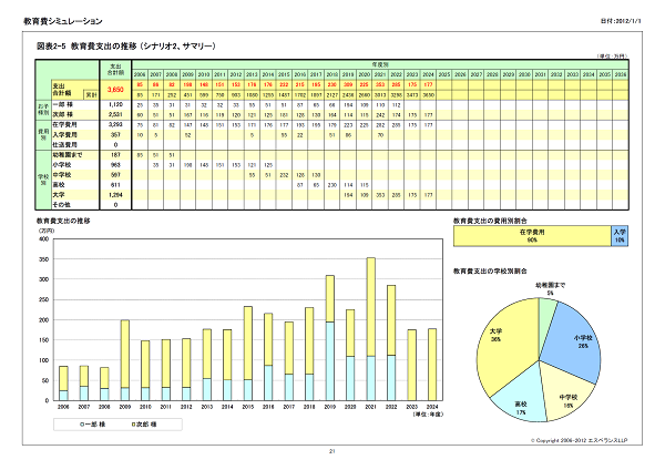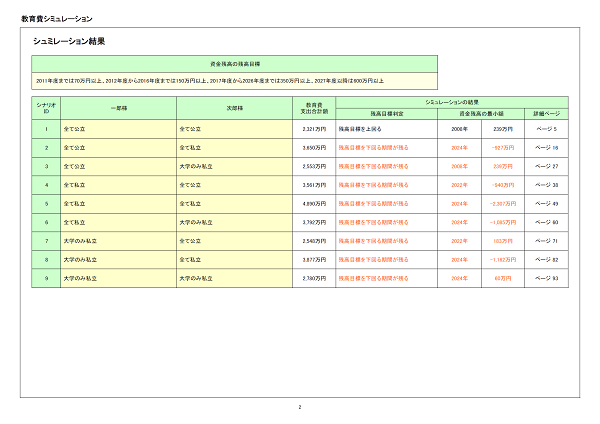 シミュレーション結果のサマリーを作成します。資金残高が残高目標を上回るかの判定や教育費の支出合計額を表示します。