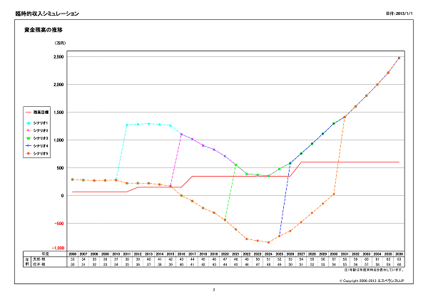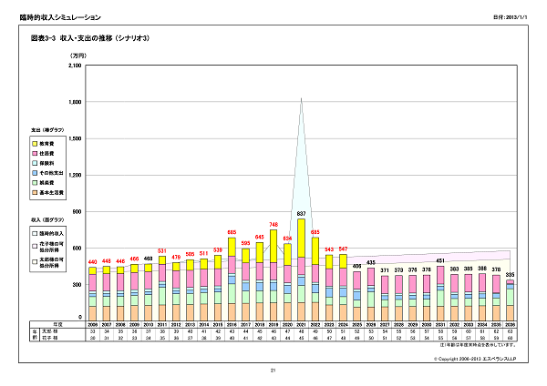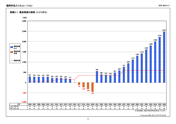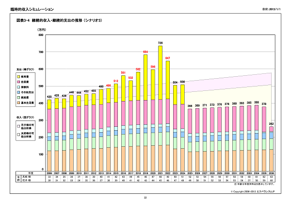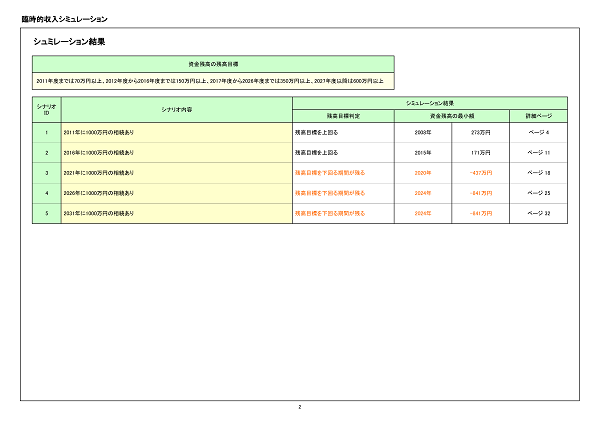 シミュレーション結果のサマリーを作成します。資金残高が残高目標を上回るかの判定や教育費の支出合計額を表示します。