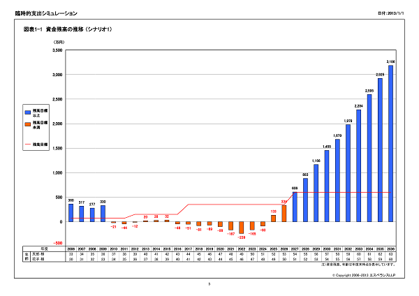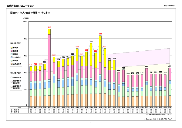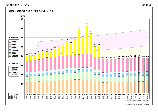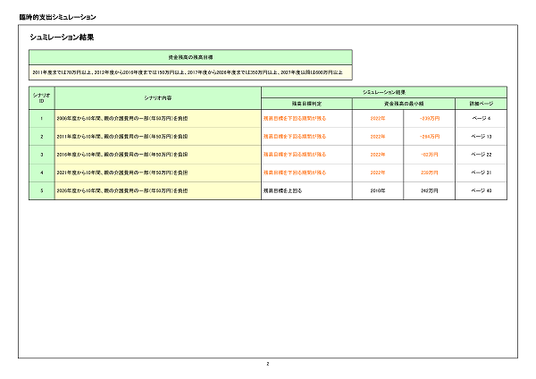 シミュレーション結果のサマリーを作成します。資金残高が残高目標を上回るかの判定や教育費の支出合計額を表示します。
