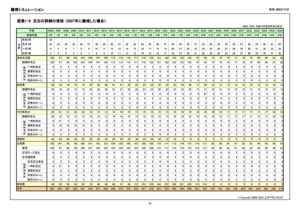 離婚後の支出の推移の表を3ページに分けて作成します。 1ページ目では、