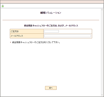 | 資金残高キャッシュフローの注文ID、および、メールアドレスを入力します。 |