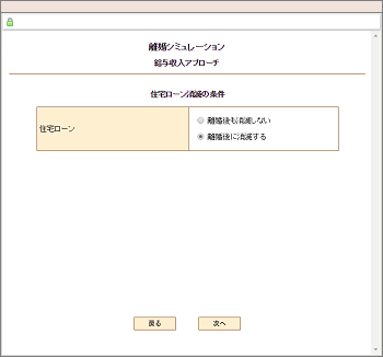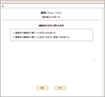 | 住宅購入前に離婚する場合、そのまま賃貸を継続するのか、それとも、予定通り住宅を購入するのかを選択します。住宅購入後に離婚する場合、または、もともと持家の場合は、離婚後に賃貸に切り替えるのか、それとも、その住宅に住み続けるかを選択します。 |