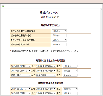 | 離婚後の基本生活費、娯楽費、その他支出、住宅諸経費(住宅購入、持家の場合)、家賃(賃貸の場合)の増減率を指定します。 |
