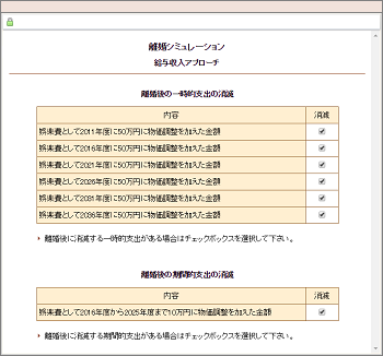| 離婚後に生ずる臨時的支出(弁護士費用、引越し費用、慰謝料や養育費←支払う場合)を入力します。 |