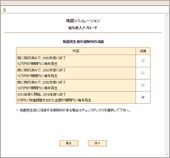 | 支出キャッシュフローで入力した保険料のうち、地震発生後に消滅するものがある場合はそれを選択します。 |