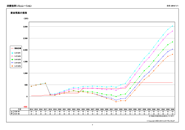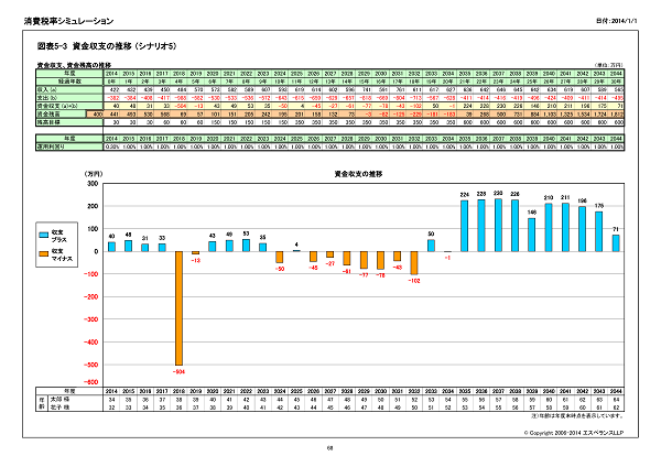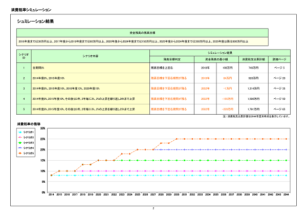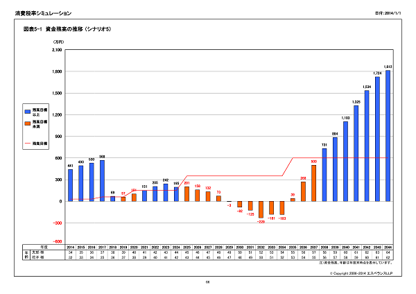 シミュレーション結果のサマリーを作成します。資金残高が残高目標を上回るかの判定や消費税支出累計額を表示します。