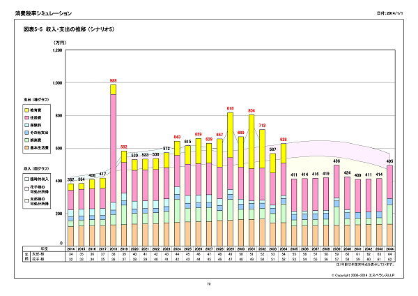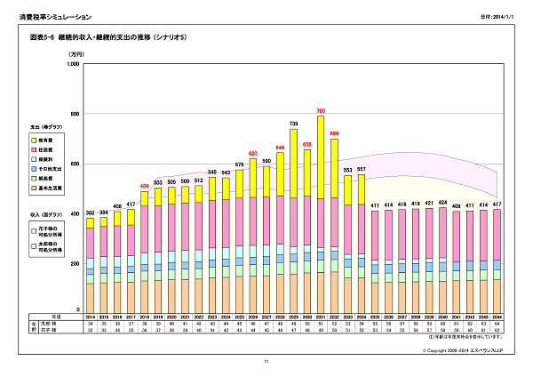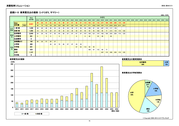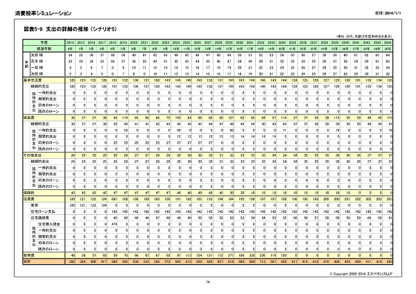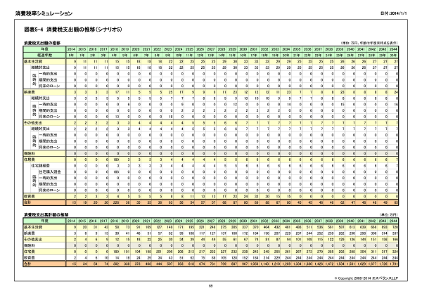 各シナリオの支出の推移の表を3ページに分けて作成します。 1ページ目では、支出の分類別の支出額や累計額の推移、また、支出累計額の分類別割合の推移を示します。2ページ目では、継続的支出の推移、各年度の継続的支出の分類別割合の推移、物価上昇率、消費税率の推移を示します。3ページ目では、支出の分類別に継続的支出と臨時的支出の細項目の推移を示します。シミュレーションで変化させた金額の部分をオレンジ色で表示します。
