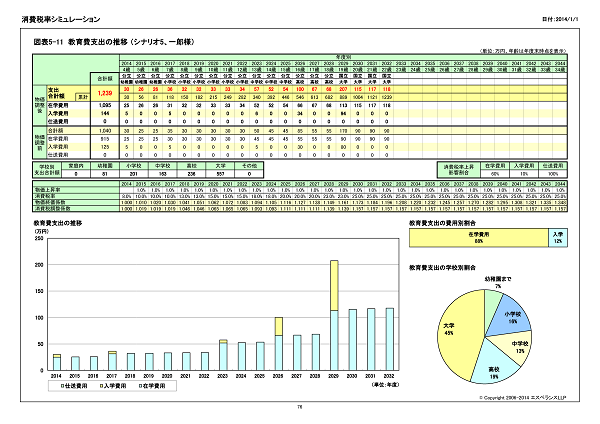 各シナリオの教育費支出の推移の表、グラフを作成します。シミュレーションで設定した教育費を表示します。