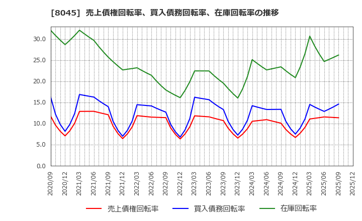 8045 横浜丸魚(株): 売上債権回転率、買入債務回転率、在庫回転率の推移
